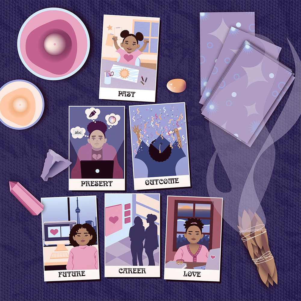 This 10x10 inch illustrations goal was to capture 6 scenes in one dwelling. My take on a dwelling was a tarot card spread. Each card revealed a major stages of my future surrounding art and design.
