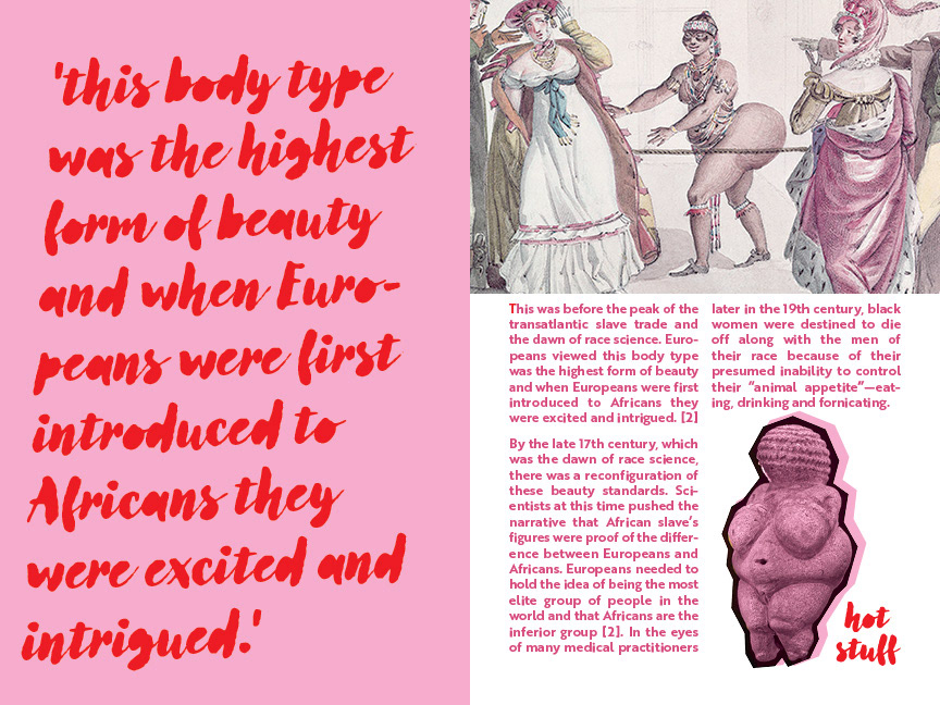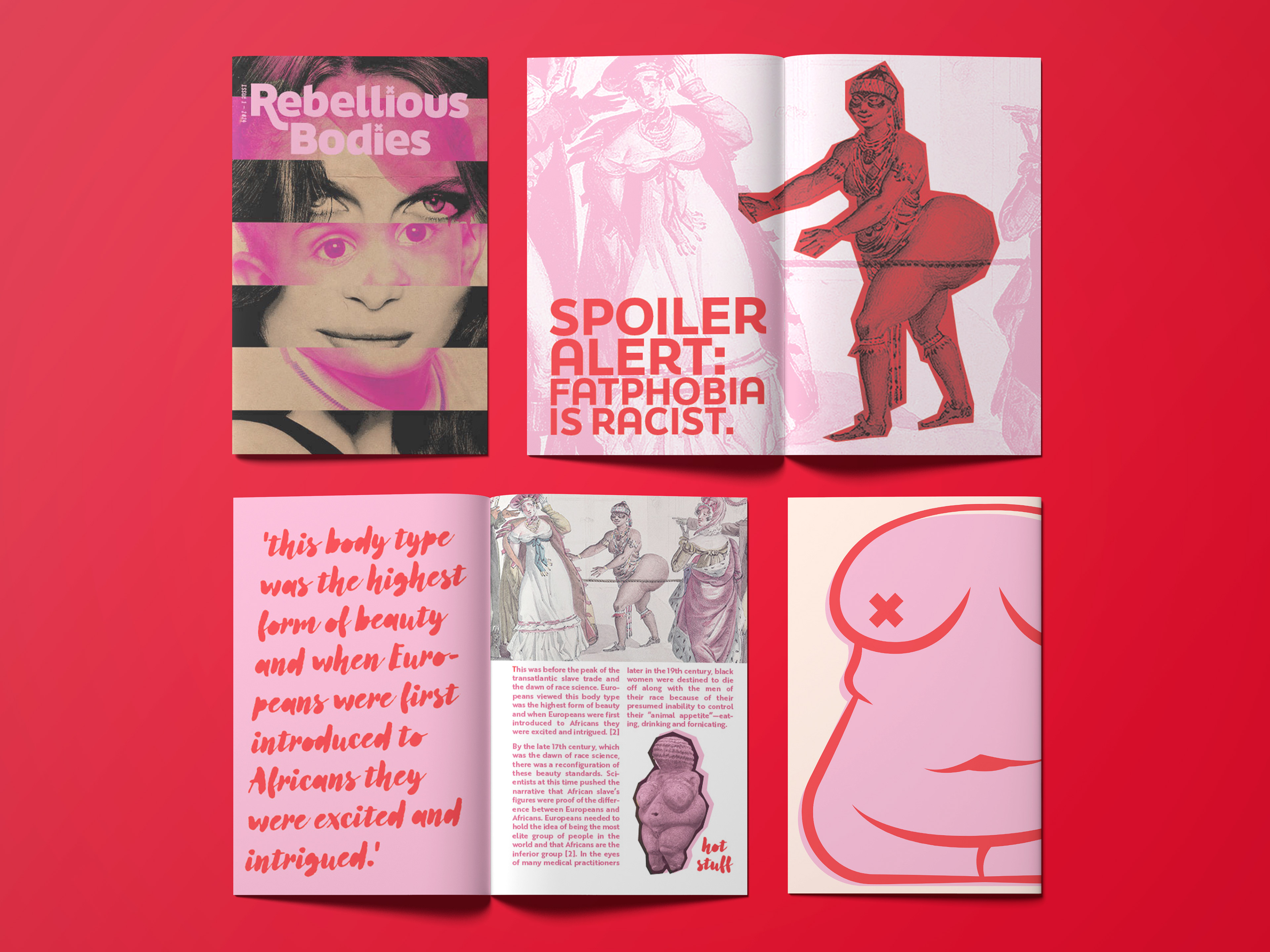 Rebellious Bodies is a 6x9 inch zine that educates and brings a sense of community for people affected by the systematic oppression of fatphobia. The zine brand identity uses a bold and feminine colour palette and typography. There are collage elements used throughout the zine that were created with Photoshop and hand drawn illustrations.